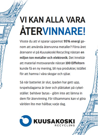 Kuusakoski Recycling är ett av Sveriges ledande företag inom återvinning och en internationell expert inom området. Vi erbjuder miljövänliga och pålitliga del- och helhetslösningar inom all slags återvinning för såväl privatpersoner som små eller stora företag, organisationer och offentliga verksamheter.
